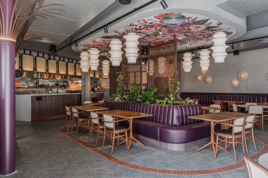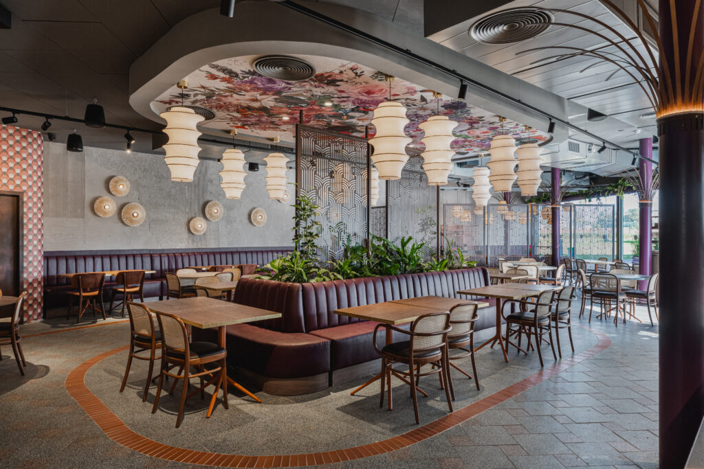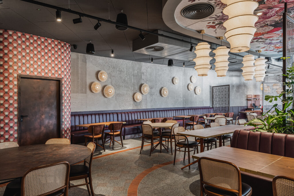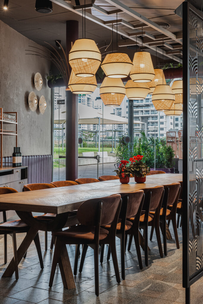 הרצון המרכזי בתכנון היה ליצור מסעדה המורכבת מאזורים שונים, כאלה שמאפשרים חוויות ישיבה מגוונות: אזור מרכזי דינמי ותוסס, פינות אינטימיות יותר, אזור VIP שמעניק תחושת פרטיות, ובר פתוח שמחבר בין המטבח לאורחים. החלוקה אינה נעשית באמצעות קירות סגורים, אלא דרך חומרים, טקסטורות, גבהים, תקרות ואלמנטים חצי־שקופים, היוצרים זרימה רציפה ומרחב שמרגיש גדול, רך ומזמין.