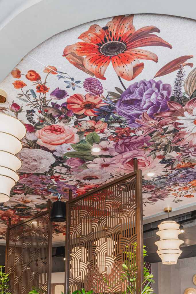 את הקונספט הגרפי פיתחנו יחד עם תמרה מויאל, מתוך מחשבה לייצר המשכיות בין הפארק שבחוץ לחלל הפנימי. ההדפס הפרחוני הוא פרשנות מופשטת לצמחייה ולתנועה אורגנית של עלים. פלטת הצבעים כוילה כך שתשתלב עם הסגולים, הירוקים והחמרה שבחלל.