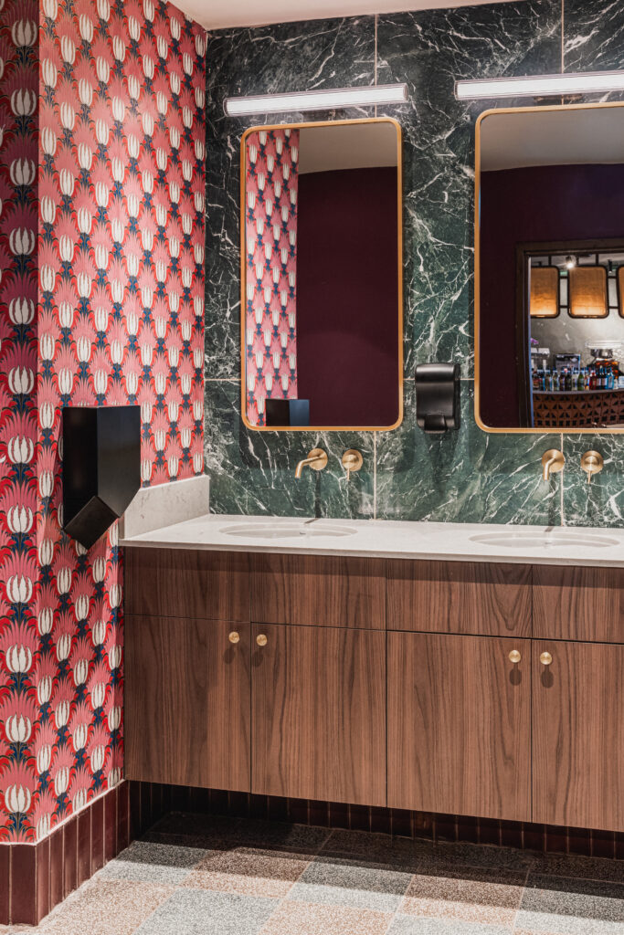 מחיצות מתכת בדוגמת אר-דקו שולבו כחלק מהאדניות וממשיכות גם לאזור ה־VIP. הן יוצרות תחושת אינטימיות מבלי לסגור את החלל, משחקות עם שקיפות וחזרתיות ומאפשרות לתחום אזורים בלי להקטין אותם בפועל.