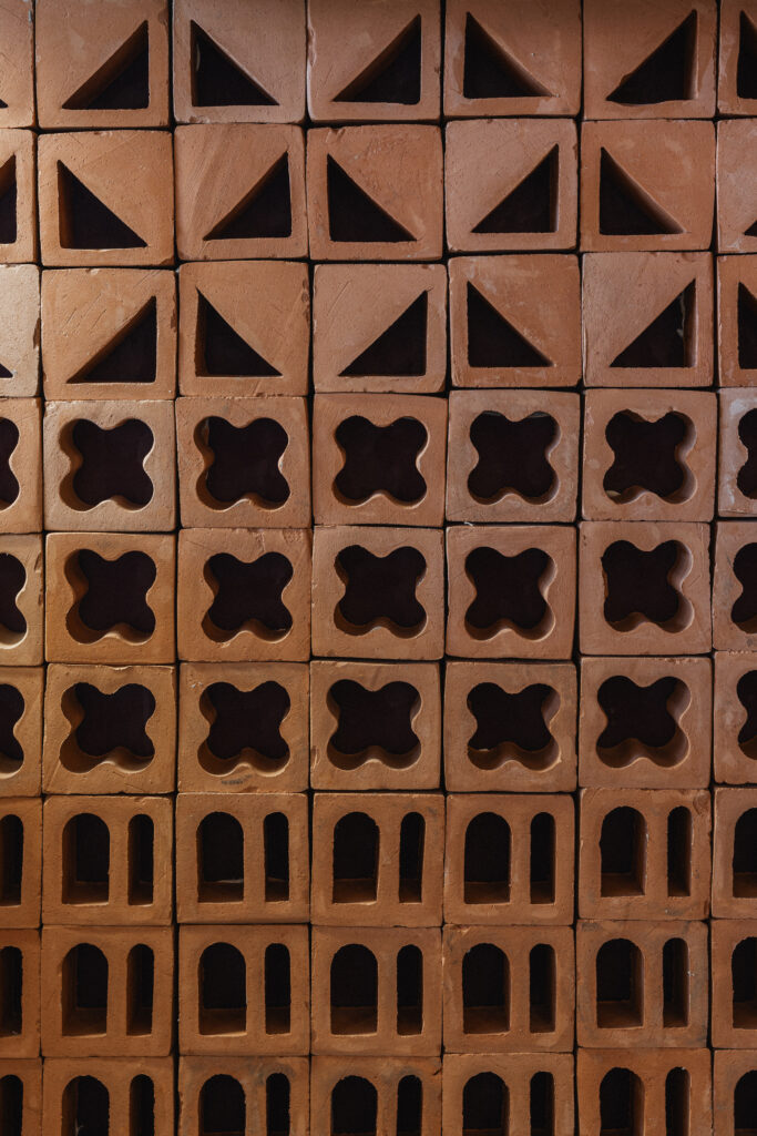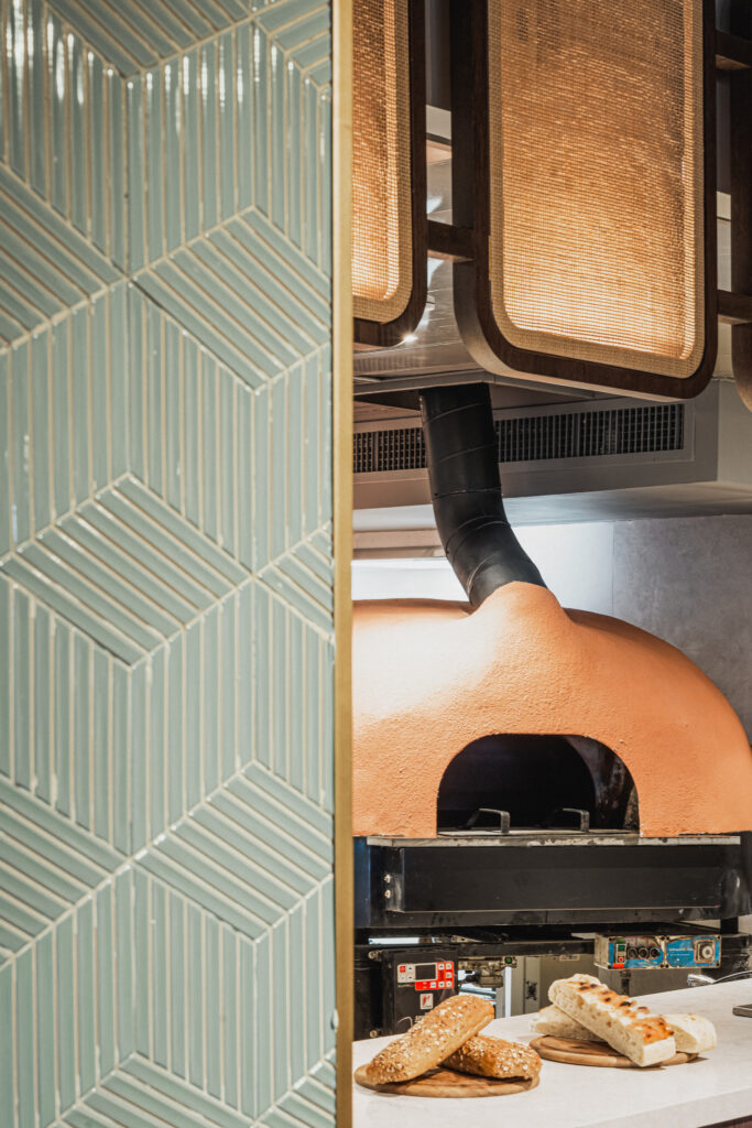 באזור הבר בחרנו לחדד את השפה עם אריחים בגוון מנטה, גיאומטריים ותלת ממדיים, היוצרים משחק אור וצל שמוסיף עומק ודינמיות. הצבע הרענן מאזכר את הירוק שבחוץ, אך הפרשנות הגרפית מעניקה לו אופי מדויק ועכשווי יותר. לצדם שולבו משרביות בעבודת יד עשויות טרקוטה, המוסיפות נוכחות חומרית גסה וחמה. החיבור בין האריחים הגיאומטריים לבין הטרקוטה הטבעית יוצר מתח מעניין בין מודרני למסורתי, בין קווים חדים לטקסטורה אורגנית.