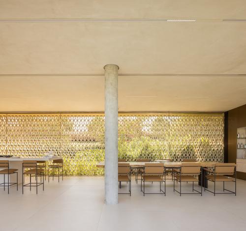 On the opposite facade, a perforated Portuguese-style screen—known locally as cobogós—offers privacy while allowing for natural light and cross-ventilation. Designed by Arthur Casas specifically for this project, the screen features a custom Y-shaped pattern, creating a distinctive and intricate aesthetic.