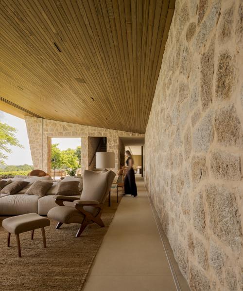 Natural materials echo the home’s location and cultural context. The facades feature local Moledo stone, applied by hand both on the exterior and select interior walls, following traditional building methods. Each stone is individually broken and arranged on site, accompanied by a beige sand-based mortar. Custom porcelain flooring was developed for the project to harmonize with the chosen materials.