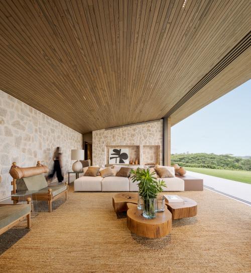 The spaces are further enriched by natural materials such as linen, suede, leather, and raw wood, complemented by ceramic accents and local Brazilian art—particularly in the master suite and entrance hall.
