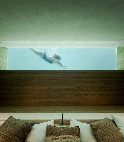 A glass wall connects this space to the pool, allowing views into the shimmering blue water and establishing a poetic dialogue between the levels.