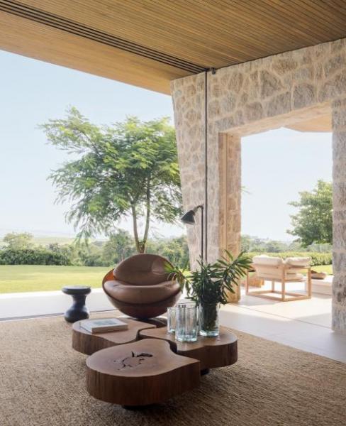 Vintage furniture is mixed with contemporary pieces and custom designs by Arthur Casas, including the dining tables, coffee table, and outdoor lounge chairs.
