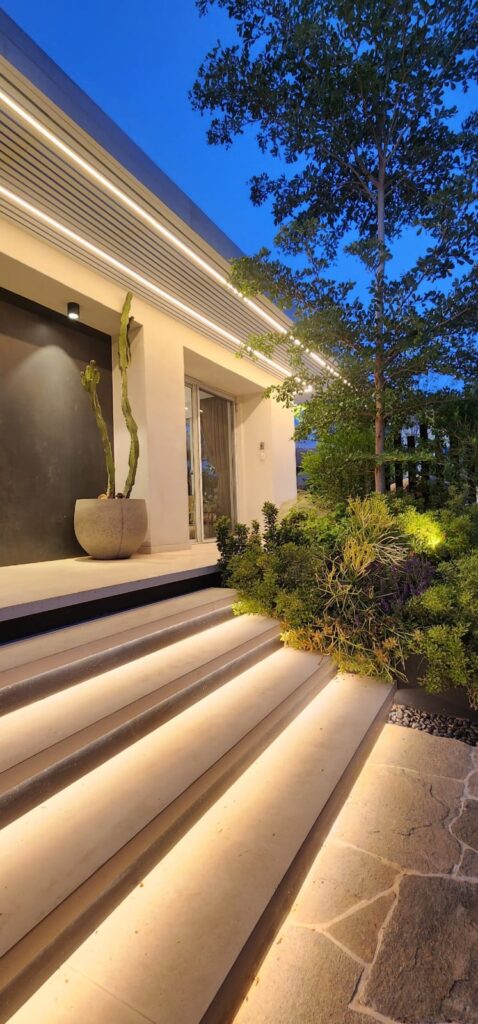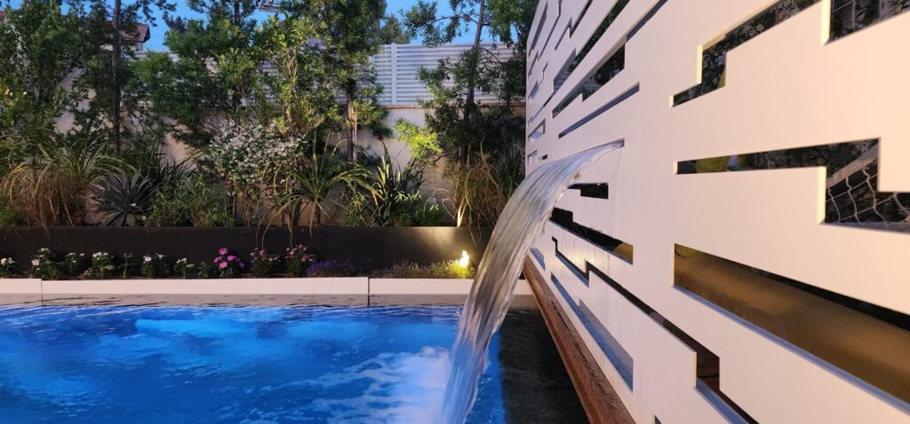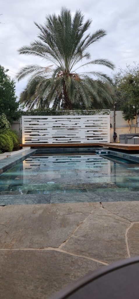 “עיצוב החוץ ממשיך את שפת הפנים: השתמשנו באבן בגוונים טבעיים, בגווני כחול לריצוף הבריכה, בתאורת מים להדגשה ובקווים טבעיים היוצרים חוויה הרמונית ושלמה”. שילוב החומרים, הסגנון והפרטים המדויקים מייצרים אווירה חמה ויוקרתית. בקצה הבריכה הוצבה מחיצה לבנה עם דוגמה מחורצת ואלמנט מים, המדגישה את השפה האדריכלית ואת החיבור בין הבית לשטחי החוץ.