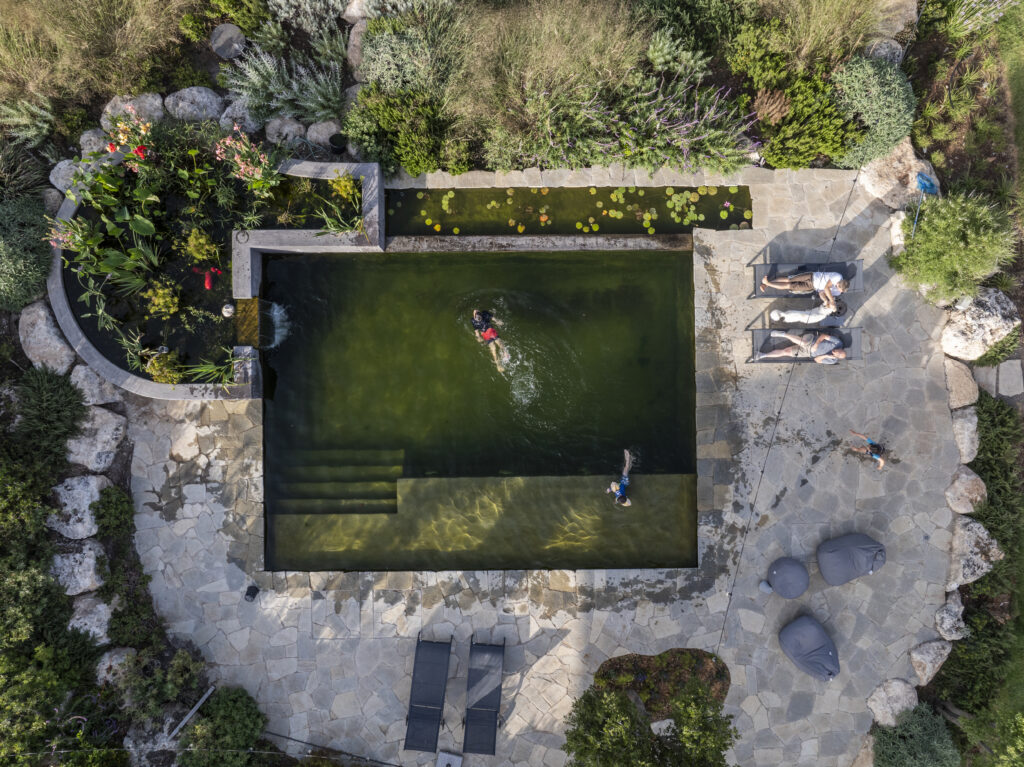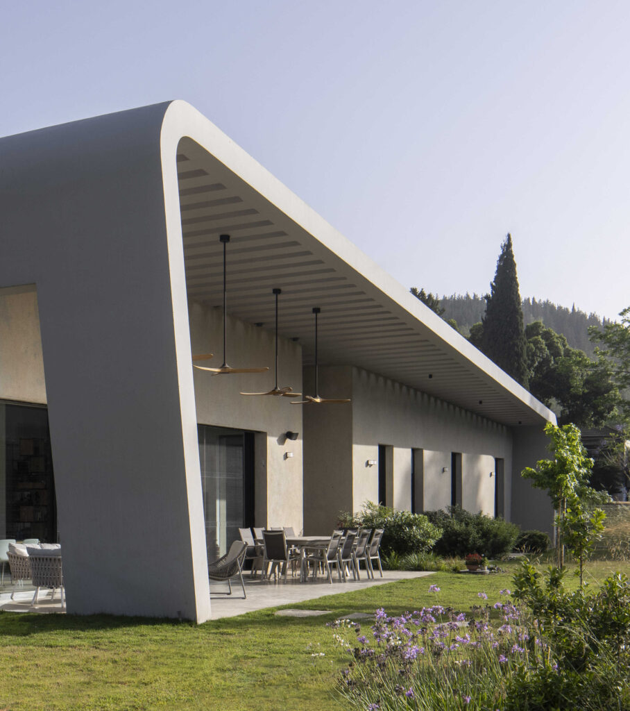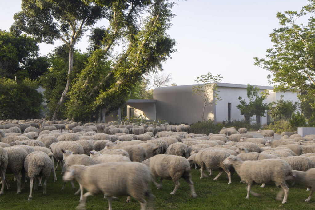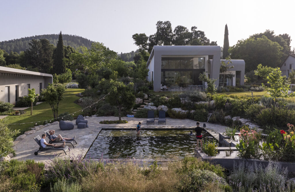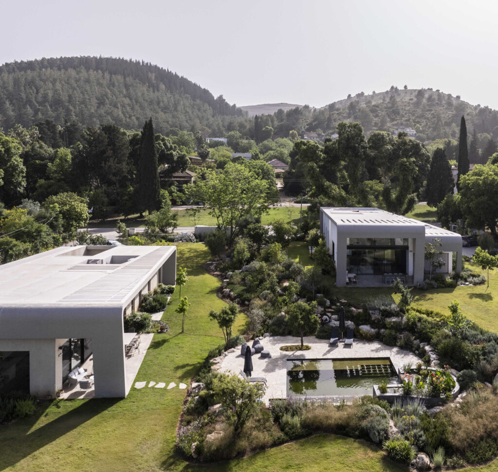 Two brothers and their families sought to build a house on a 5-dunam estate in Yokneam Moshava. Each house was designed on a 300-square-meter plot, and they share a spectacular courtyard and ecological swimming pool. “The extensive area, the open landscape, the agricultural context and the people inspired an initial concept of organic bodies ‘herding’ the area,” say the architects, adding that a herd of sheep that unexpectedly passed through the estate on the day of the filming “closed the corner for us and told the whole story.”