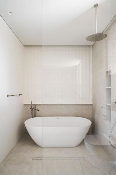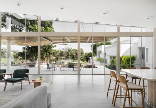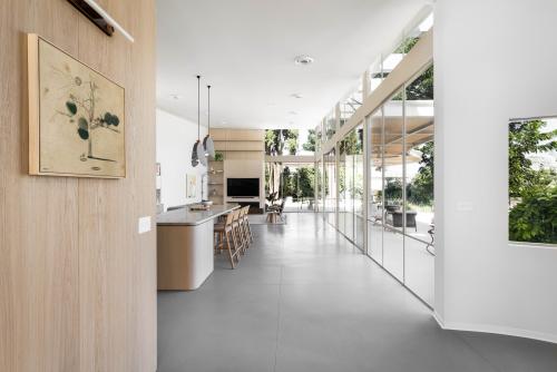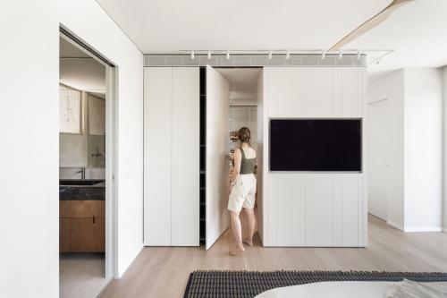 בפנים יושרו חלק מקירות הפנים ונבחרו דלתות קו אפס שיוצרות מראה נקי והמשכי. הנמכות תקרה מינימליסטיות תוכננו בשילוב תאורה שקועה הממשיכה את הקווים.