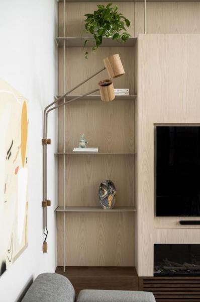 מחיצת עץ ורטיקלית חושפת חלקית את המבואה ותורמת לתחושת המרחב. תראו גם את יחידת הנגרות בסלון, המשלבת טלוויזיה, מערכות ואת הקמין הקיים – "היה לנו ברור שהקיר הזה צריך להיות אלמנט משמעותי בחלל. בנינו את הספריה סביב הקמין כדי שתכלול את האוורור והארובה שלו וכן מקום לאחסון ודקורציה" מסבירה המעצבת.