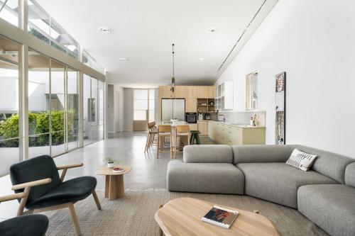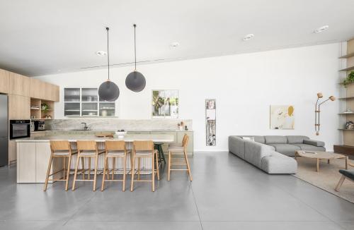 בעזרת החלפת חומרי החיפוי, ניצול הגובה והחלונות הגבוהים של הבית וחלוקת הפנים מחדש, הם הצליחו להשתלב עם האדריכלות הקיימת ולייצר בית שמותאם להם מבחינת סגנון, פונקציונאליות.