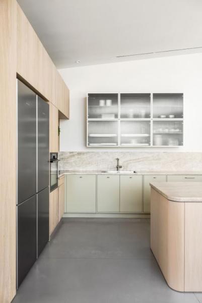 במטבח למשל, שולבו שני גוונים של עץ – פורניר אשא מחפה את האי ופורניר אלון את הארונות הגבוהים.