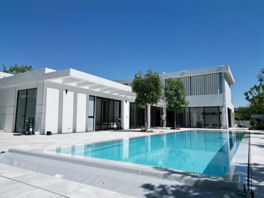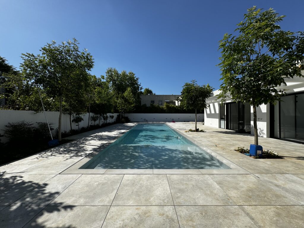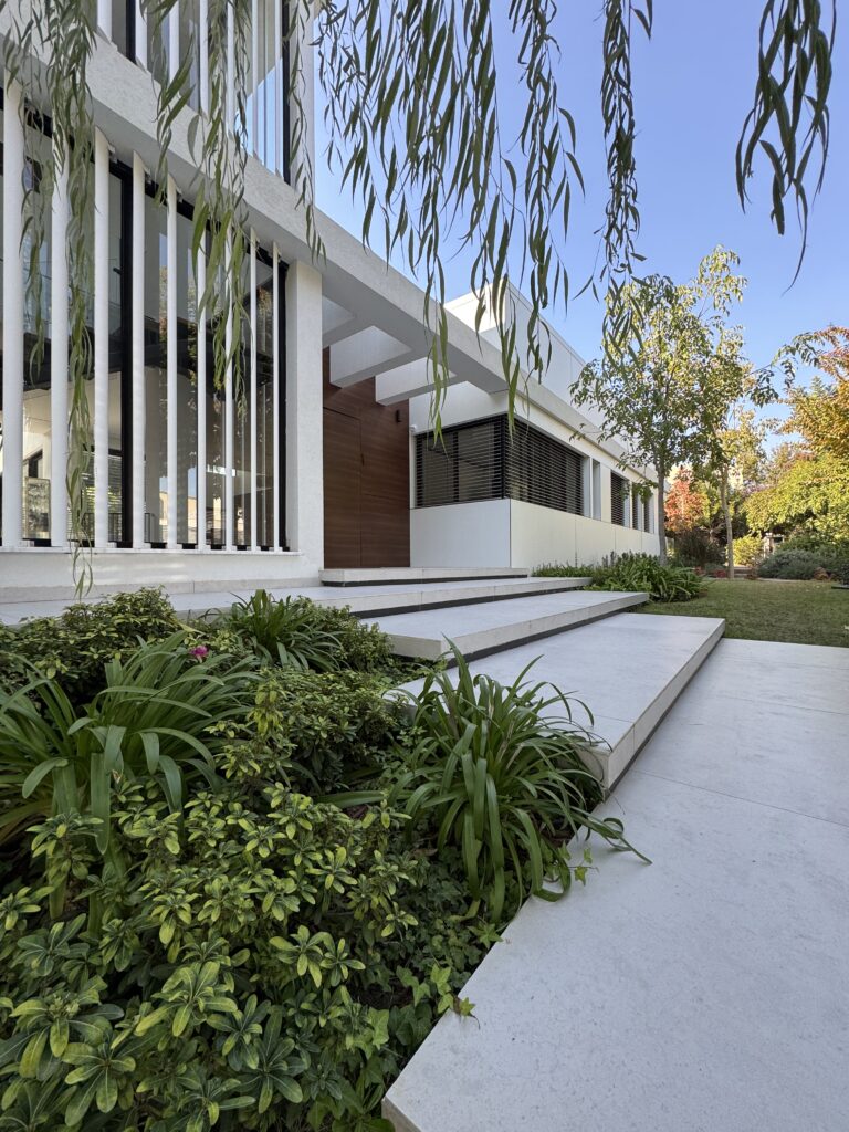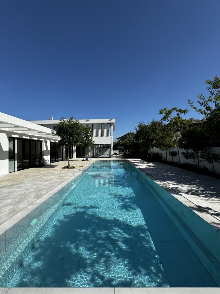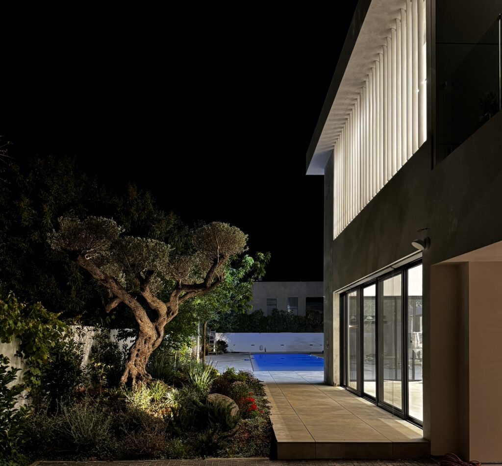במקביל להקפדה על חומרים עמידים ואיכותיים במראה מודרני, הושקעה מחשבה רבה גם בתכנון הנוף: בקרבת הבריכה נשתלה צמחייה נמוכה לשמירה על קו נקי ומבט פתוח לנוף; לאורך הגדרות שולבו עצים ירוקי-עד ליצירת פרטיות והצללה; ומוקדי צבע נוצרו בעזרת פרחים עונתיים ושרכים טרופיים, שהוסיפו רעננות ועניין. "העדפנו צמחים חסכוניים במים ועמידים לאקלים המקומי, כדי לייצר גינה בת-קיימא עם תחזוקה מינימלית", הוא מסכם.
